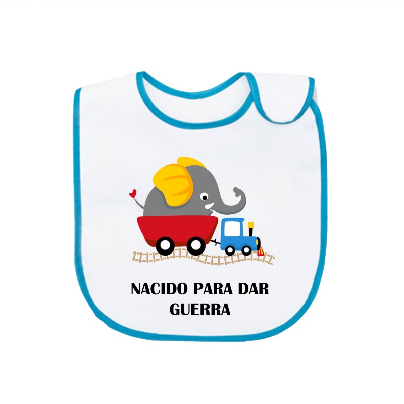 Babero blanco con ribete azul celeste Nacido para dar guerra